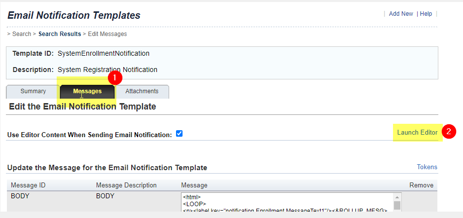 3. Enter the Template Id where the changes need to be done. E.g. SystemEnrollmentNotification. Then click change button.